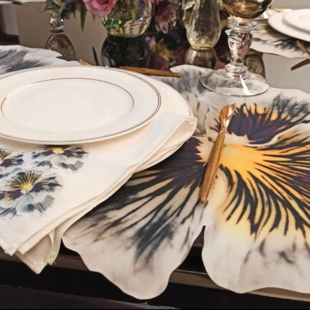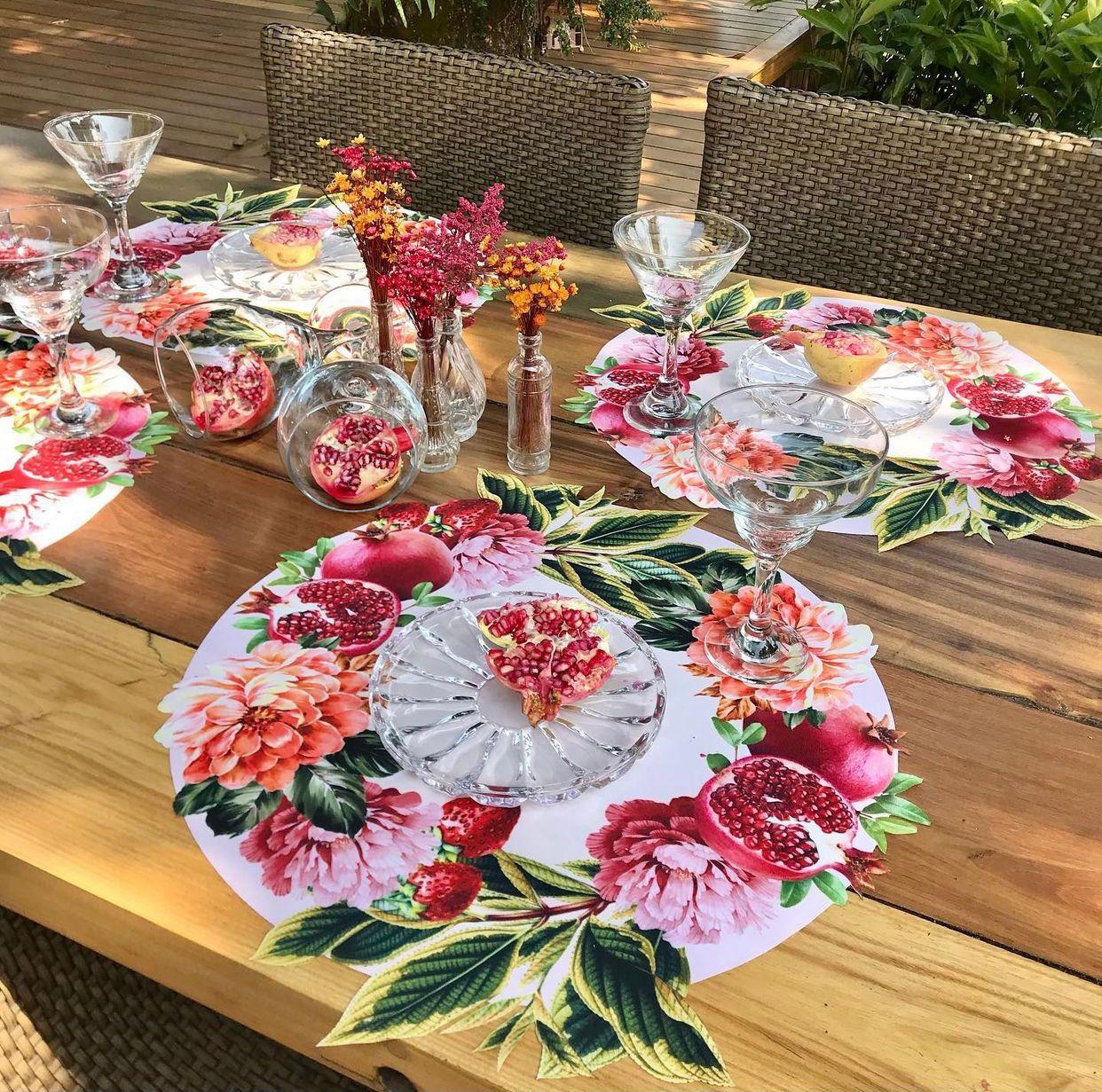 Jogo Americano Tecido Impermeável Importado. 100% Poliéster. Medidas: 45 cm de diâmetro. As medias das peças consideram as larguras máximas dos recortes de cada peça.