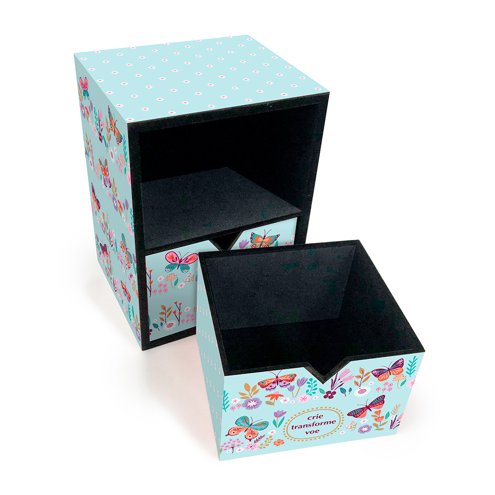 O Gaveteiro Borboletas no Jardim combina funcionalidade e design encantador para deixar seu espaço mais organizado. Com duas gavetas internas, é ideal para guardar pequenos objetos de papelaria, joias ou acessórios, mantendo tudo protegido com o acabamento interno aveludado. Um item versátil que decora e organiza ao mesmo tempo — ótima opção de presente criativo para quem valoriza charme e praticidade!