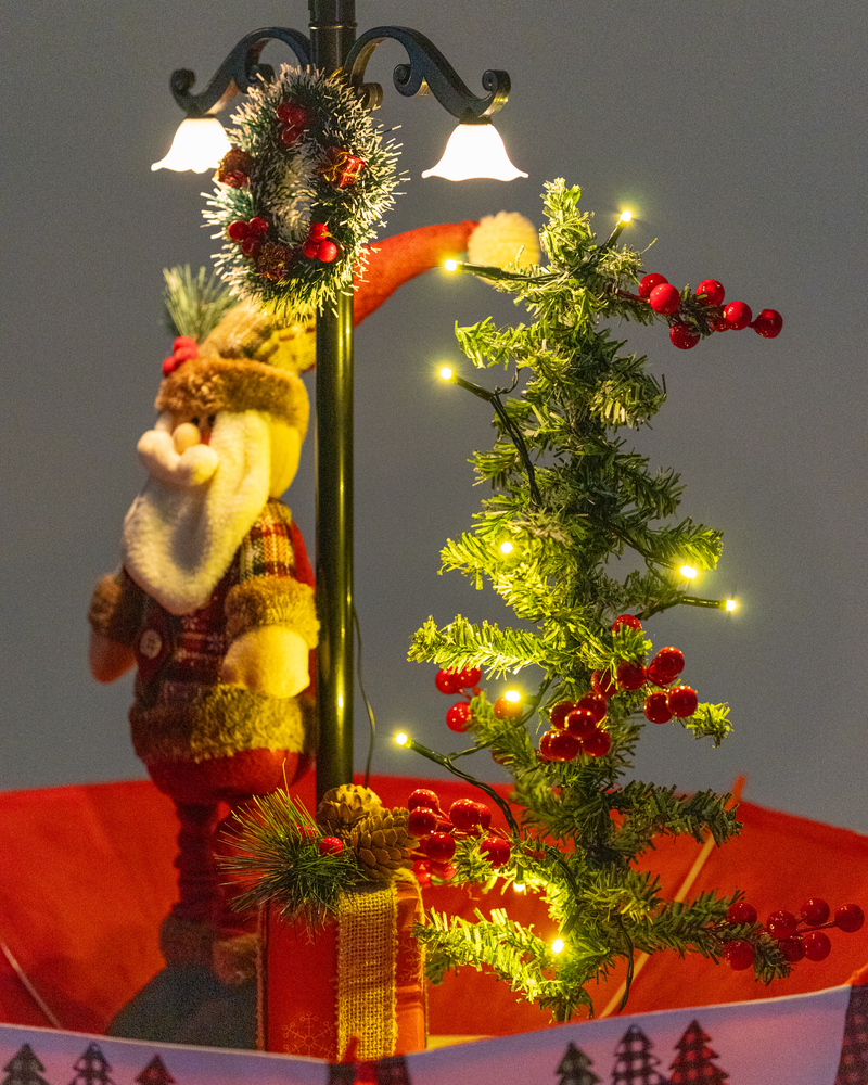 Árvore de Natal, com Papai Noel, base de guarda-chuva com neve, iluminação, música 65 x75