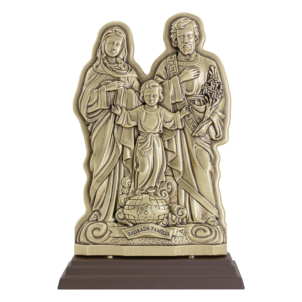 Adorno da Sagrada Familia com Oracao Metal Ouro Velho e Acrilico 20cm