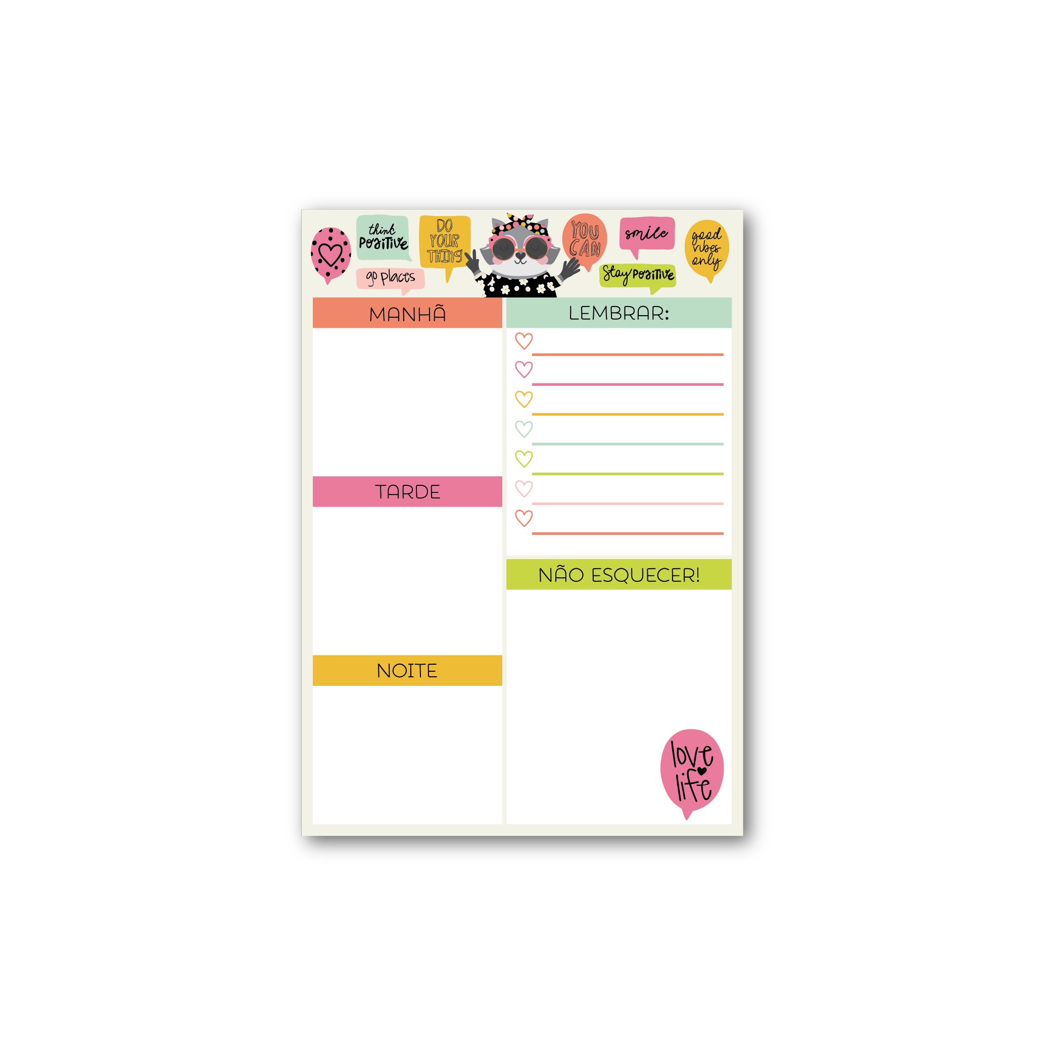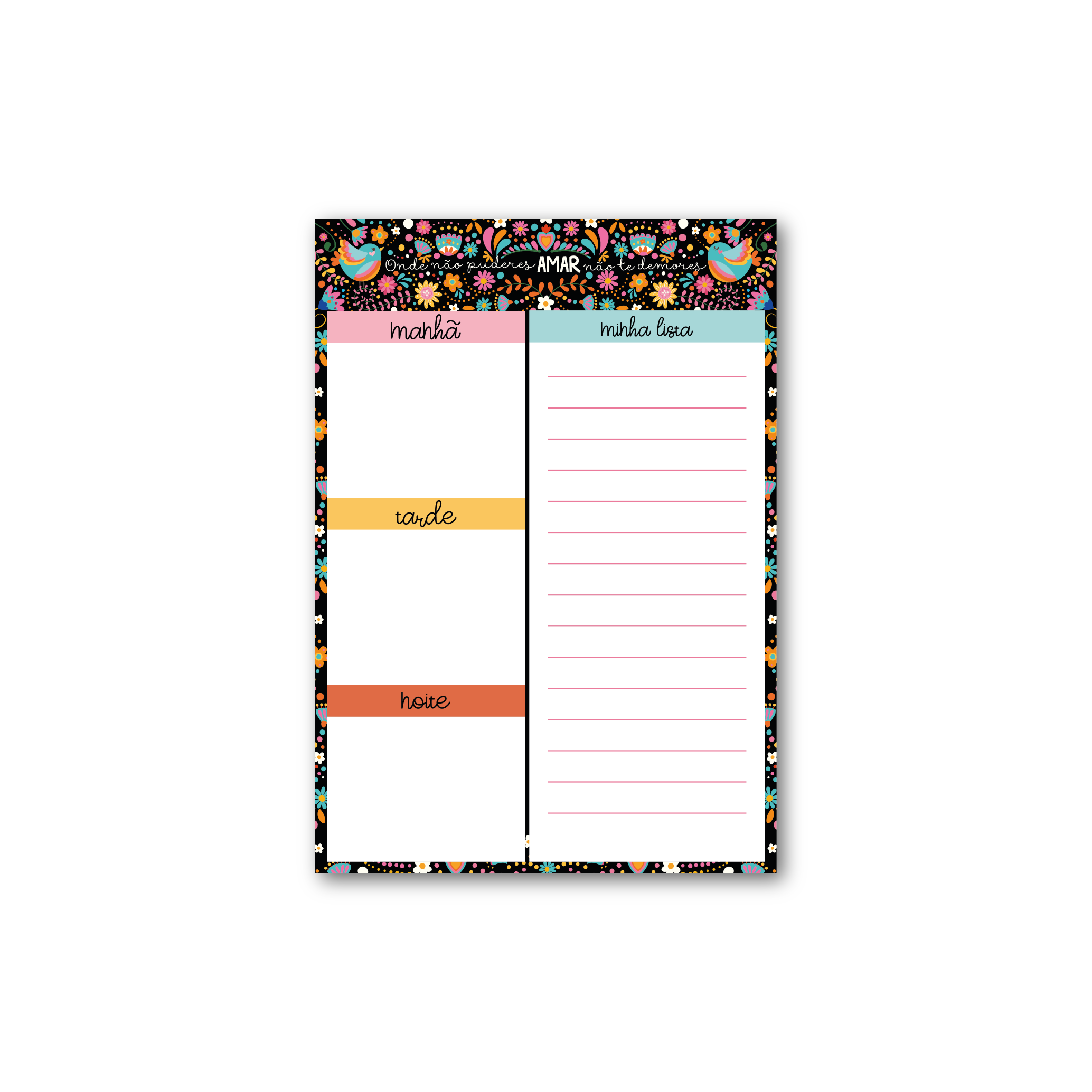 Com 60 folhas decoradas, nosso bloco tem espaço para todos os seus compromissos do dia além de espaços extras com listas de tarefas e anotações gerais.